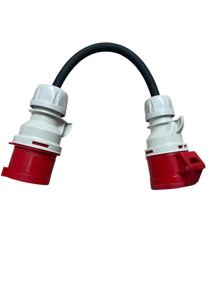 Adapterkabel 5x2,5 mm² 5-polig. Eingang: CEE 32A 5p Stecker. - Ausgang: CEE 16A 5p Kupplung MDRLED